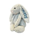 We use delicate hand embroidery to add your chosen name or message on the ears with various font options. Kids will be delighted to place their custom bunny in Easter baskets, making it a highly desired gift for Easter and welcome parties.